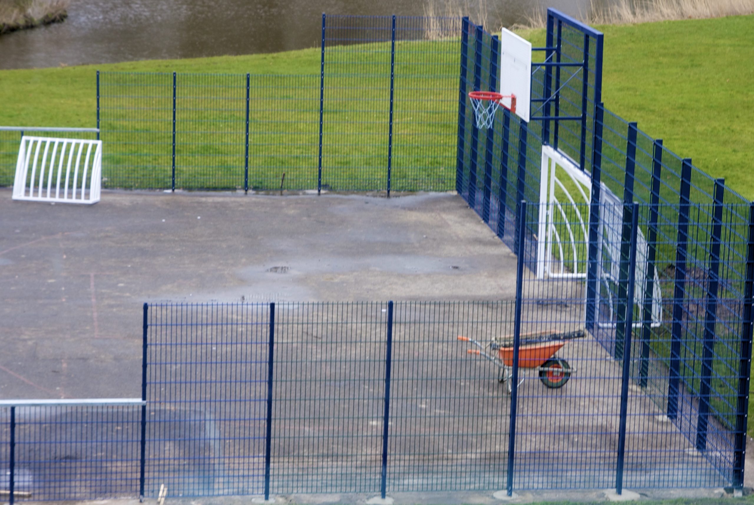 Natuurlijk is het ontwerp door een extern bureau gedaan. Het is een multifunctioneel apparaat aan het worden. je kunt er basketballen en in voetballen. Nu maar hopen dat er geen gang-wars zullen uitbreken tussen de voetballers en de basketballers wie het alleen recht heeft om op dit stukje asfalt te spelen.