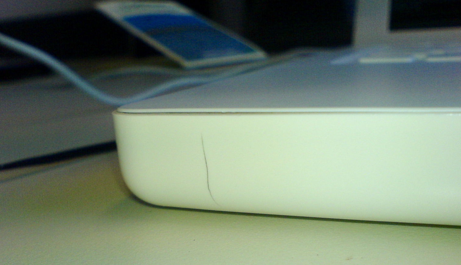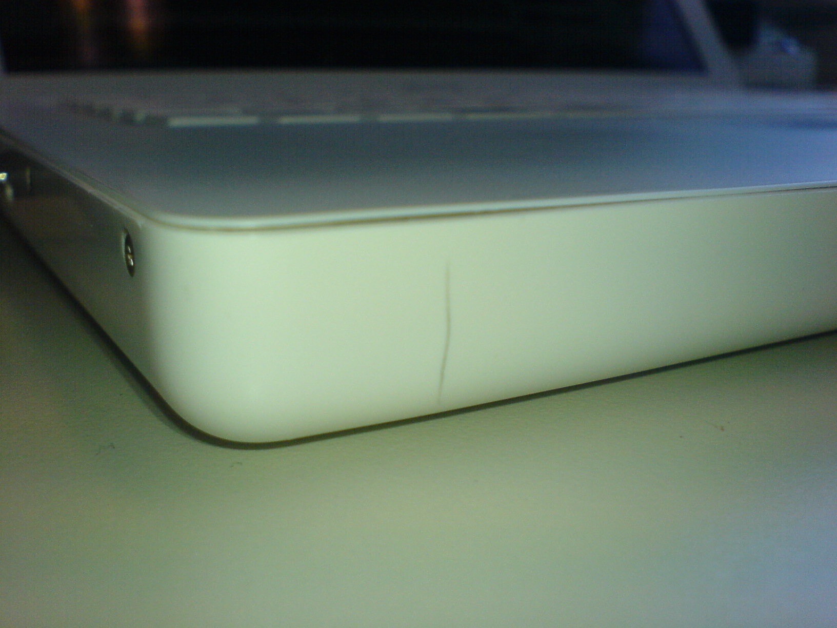 links voor de laptop behuizing zat een vrij klein scheurtje. Maar kleine scheurtjes willen groot worden en dat doen ze dan ook. Macme Leeuwarden wilde mij niet helpen met deze scheuren. Ze waren mijn eigen schuld. Alsof ik elke dag loop te basketballen met mij Macbook. Ik heb me er maar bij neergelegd dat een Macbook scheuren hoort te hebben.