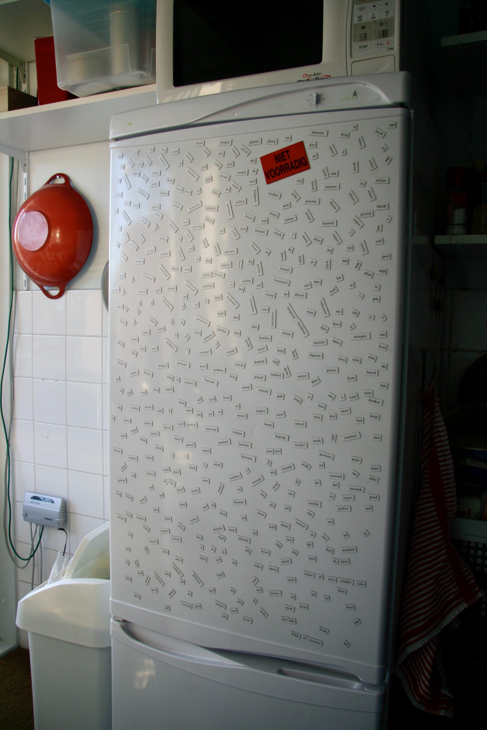 Paar weken geleden zag ik bij Sypie iets leuks op zijn koelkast. Hij had honderden woorden met magneetjes op zijn bierkoeler. Had hij en zijn vrouw ooit gekocht in be Bijenkorf in één of andere afprijsmand. Zonder dat je er erg in heb ga je er toch mee bezig. Je bent aan het zoeken naar nieuwe zinnen combinaties.