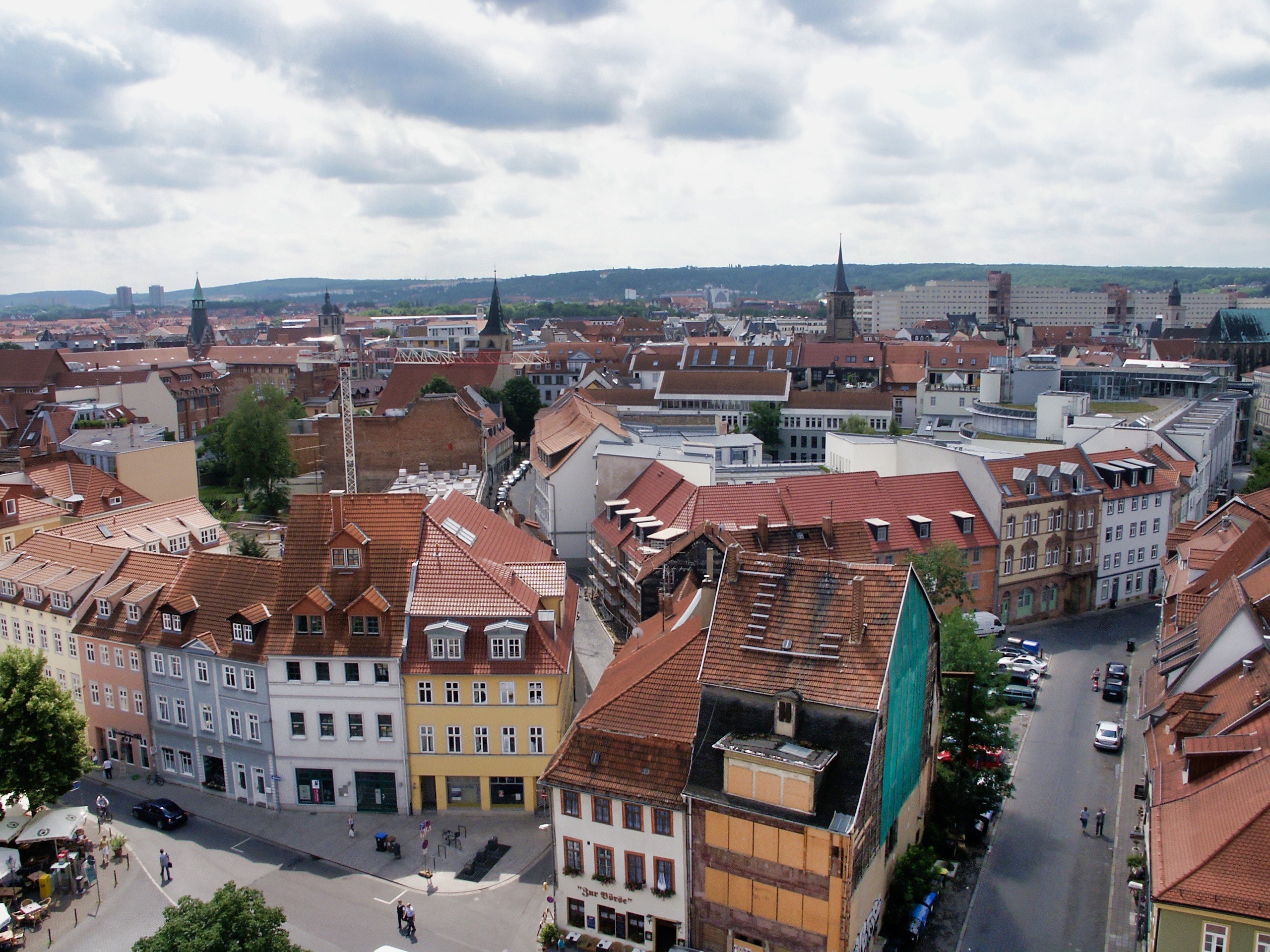 Er was voor het hele weekend slecht weer voorspeld. Maar toen ik vrijdag wakker deed een blik naar buiten mij iets anders zien. Ben maar mooi in een korte broek en zomers hempje geschoten. Het was al halverwege de middag. IS was al naar Erfurt omdat zij een nieuw paspoort en wat andere papieren nodig had. Ik mocht van haar uitslapen. Lief he. In de stad aangekomen heeft ze mij een rondleiding gegeven. Het feest van dit weekend draait om de Krämer Brücken brug. Dus daar zijn wij begonnen op de uitkijktoren van de ägidienkirche kerk. Die zit aan de Krämer Brücker brug vast. Flink wat trappen in deze hitte is waanzin. Maar het uitzicht is geweldig. Daar heb ik wel een jumpknie voor over :p