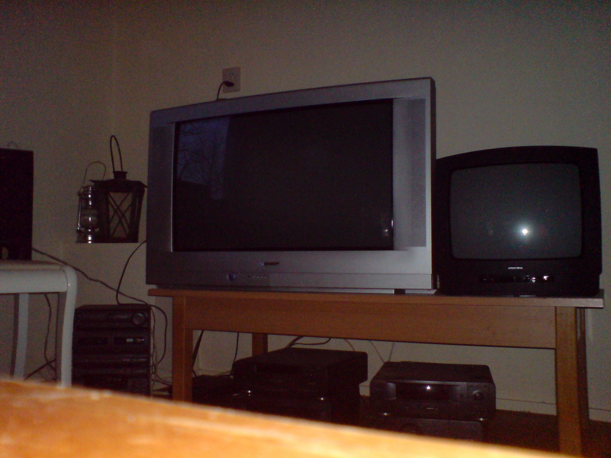De waarheid is veel schokkender. De grote televisie heeft niet de juiste zenders in geprogrammeerd. Voor de eigenaar was het veel minder moeite om een kleine televisie aan te sluiten die wel alle zenders heeft.